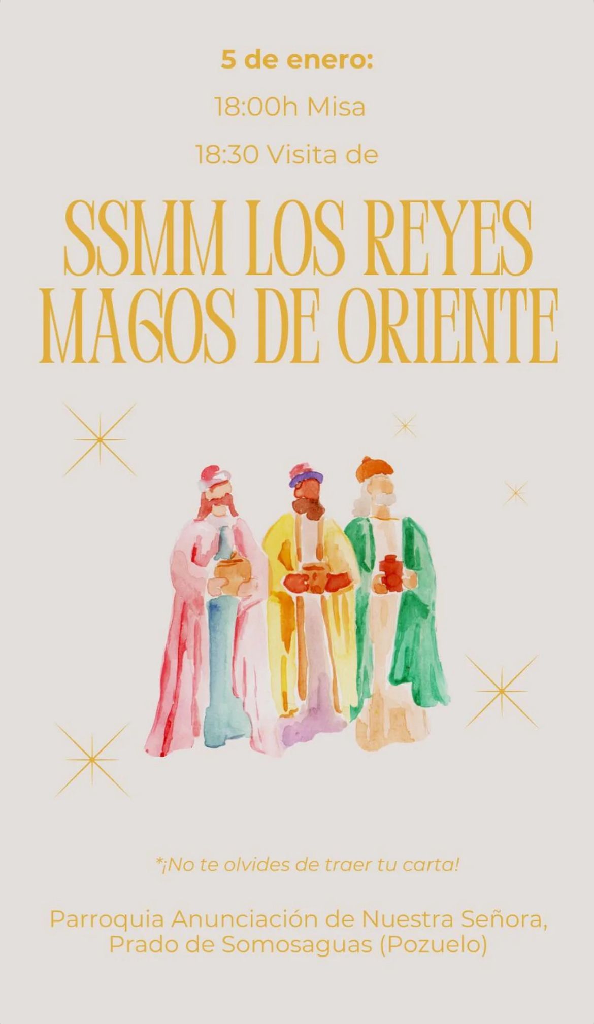 El próximo 5 de enero despues de la Misa de 18.00 nos visitarán para recoger las cartas de todos los niños y no tan niños que quieran entregarselas para recibir sus regalos.