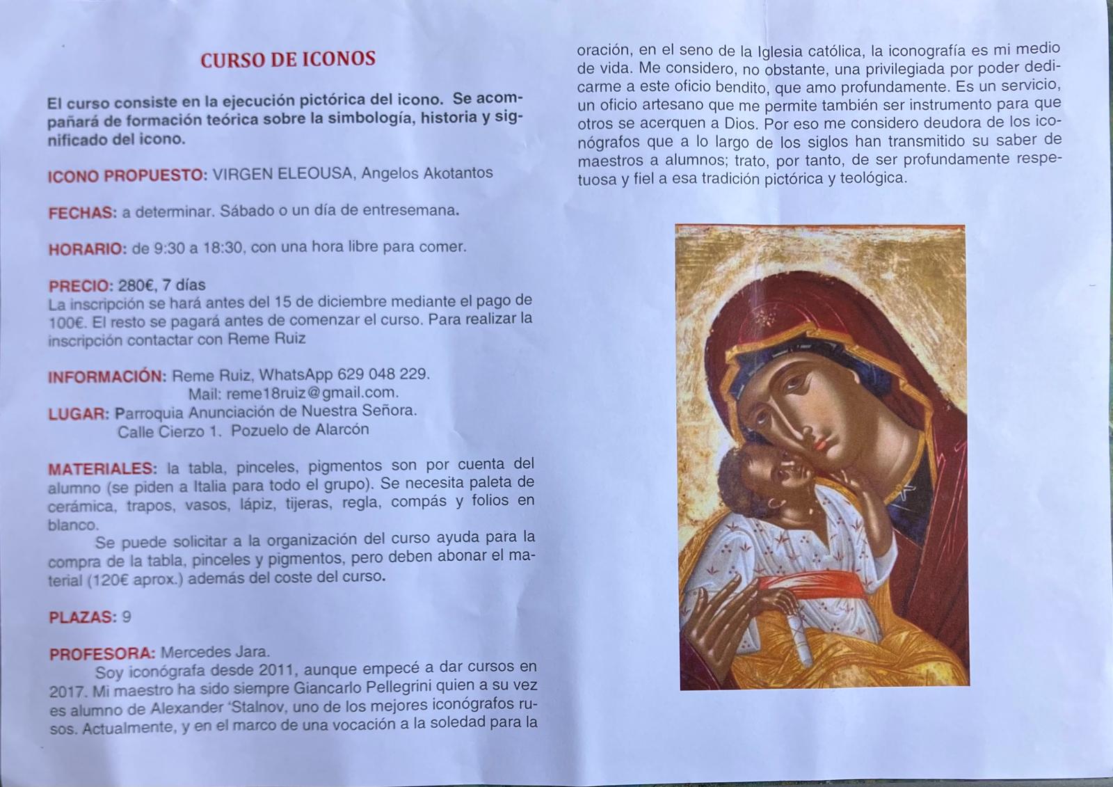 Os presentamos un curso sobre Iconos maravilloso 7 dias completos de 9:30 a 18:30, en 7 semanas, 280€ Para apuntaros contactad con REME RUIZ en el 629048229 o en reme18ruiz@gmail.com…